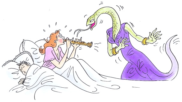 “Une main dirigea un cobra vers moi pour qu’il me morde latéralement au sein droit. II était très impressionnant gueule ouverte, deux crocs recourbés sur la mâchoire supérieure. Sa tête était rouge, son corps jaune vif. On le tenait juste à ces démarcations. Je ne sais comment y échapper. J’ai crié et je me suis réveillée.”