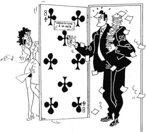 - Je rêve d’un voyant qui passe de village en village, il lit -sur les cartes-. Quelqu’un tire un huit de trèfle et s’en va en moto. Je pense : ce voyant – gagne de l’argent facilement-. Il dit au client qu’il mourra à quarante ans.